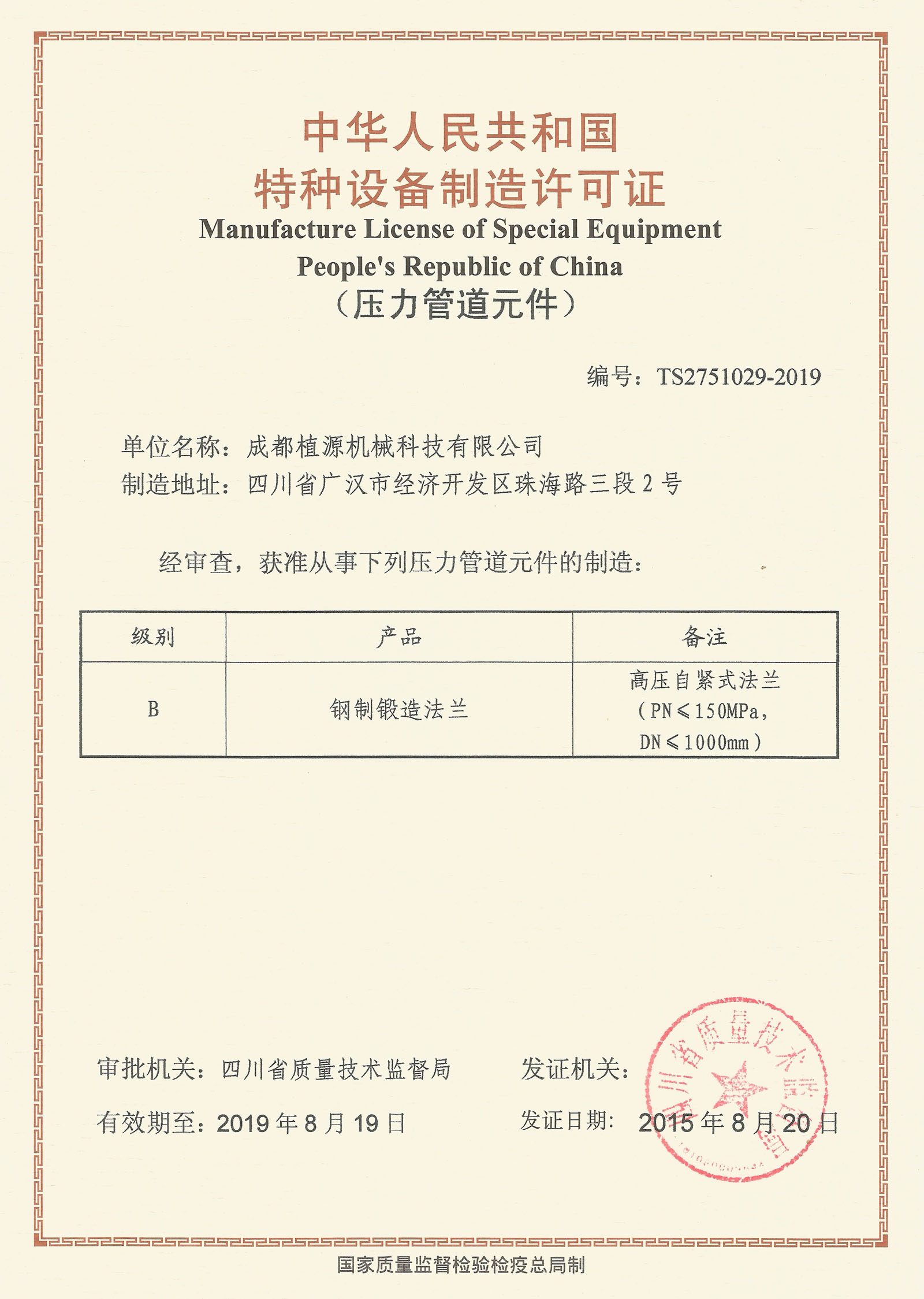 2015820日,我司取得省質(zhì)量技術(shù)監督局頒發(fā)的特種設備制造許可證新證,有效期至2019819日。